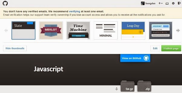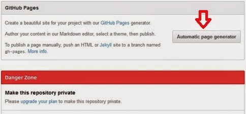 Pada halaman selanjtnya, scroll ke bawah sampai bagian Github Pages, klik Automatic Page Generator, karena sebelum dapat menyimpan file kita harus membuat halaman terlebih dahulu