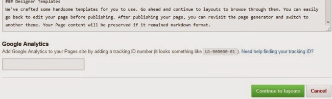 Selanjutnya klik Continue to layouts. Isikan kode google analytics jika ingin halaman tersebut di track.